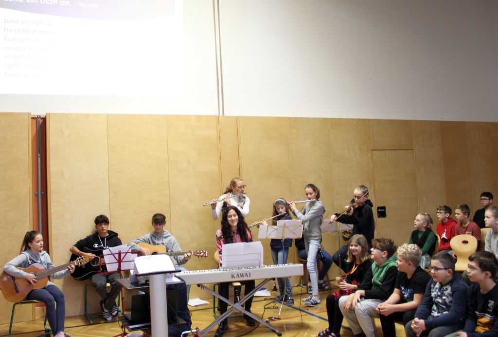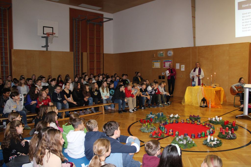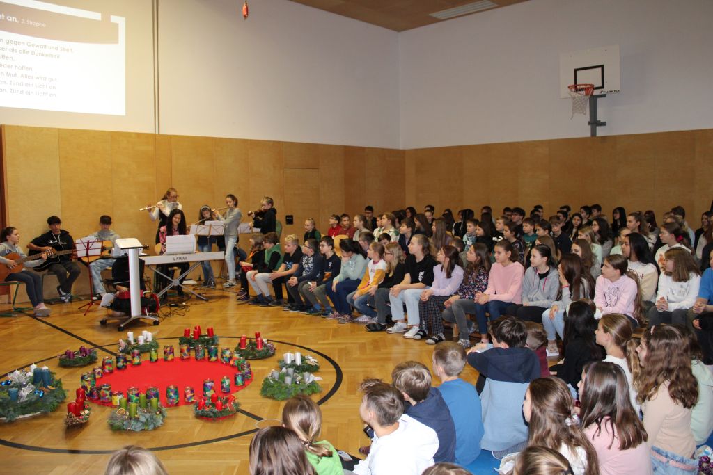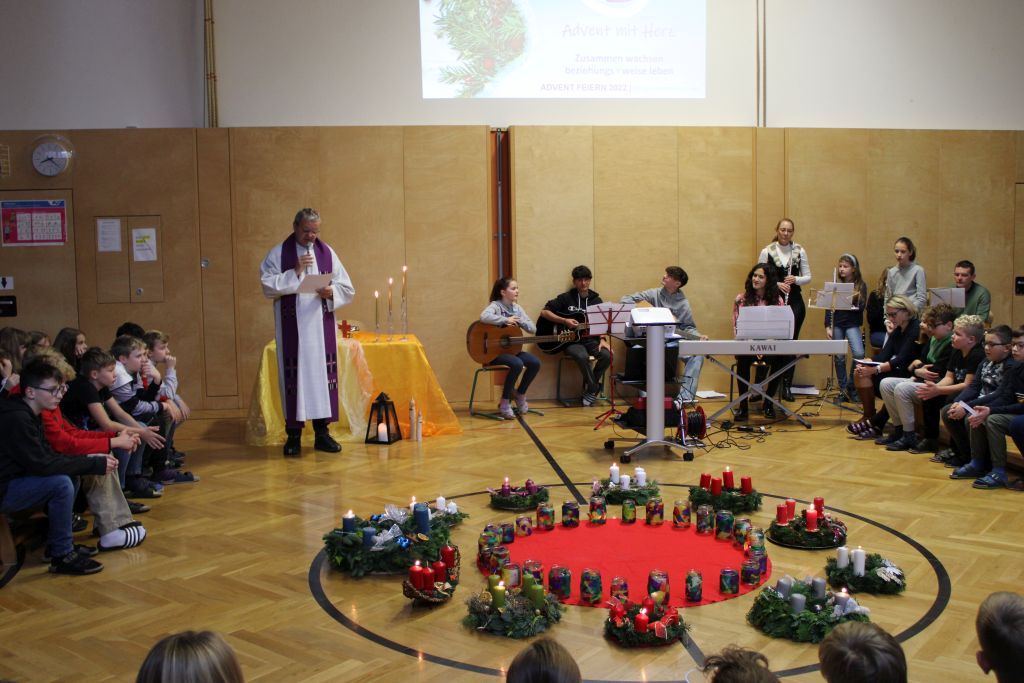 Den Adventbeginn feiern wir in der Brucknerschule gemeinsam und jede Klasse kommt mit ihrem schön geschmückten Adventkranz in den Turnsaal zur Adventkranzsegnung. Schüler:innen aus verschiedenen Schulstufen wirken mit bei der musikalischen Gestaltung und wir genießen den festlichen Rahmen. Herr Mag. Vormayr leitet die Feier und erklärt uns die Worte der Bibel, das Evangelium vom blinden Bartimäus. Unser Jahresthema „Zusammenwachsen – beziehungs©weise leben“ ermutigt uns, im Advent ganz viel Herz zu zeigen.