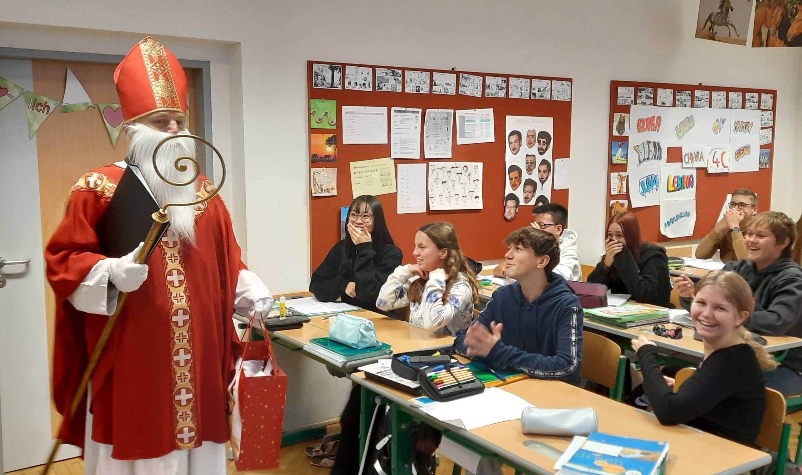 Der Nikolo brachte am 5. Dezember die Augen der Schülerinnen und Schüler noch einmal zum Leuchten. Nach mahnenden Worten – in der Abschlussklasse viel zu lernen – wurden von den Klassenvorständen gesunde Gaben verteilt.