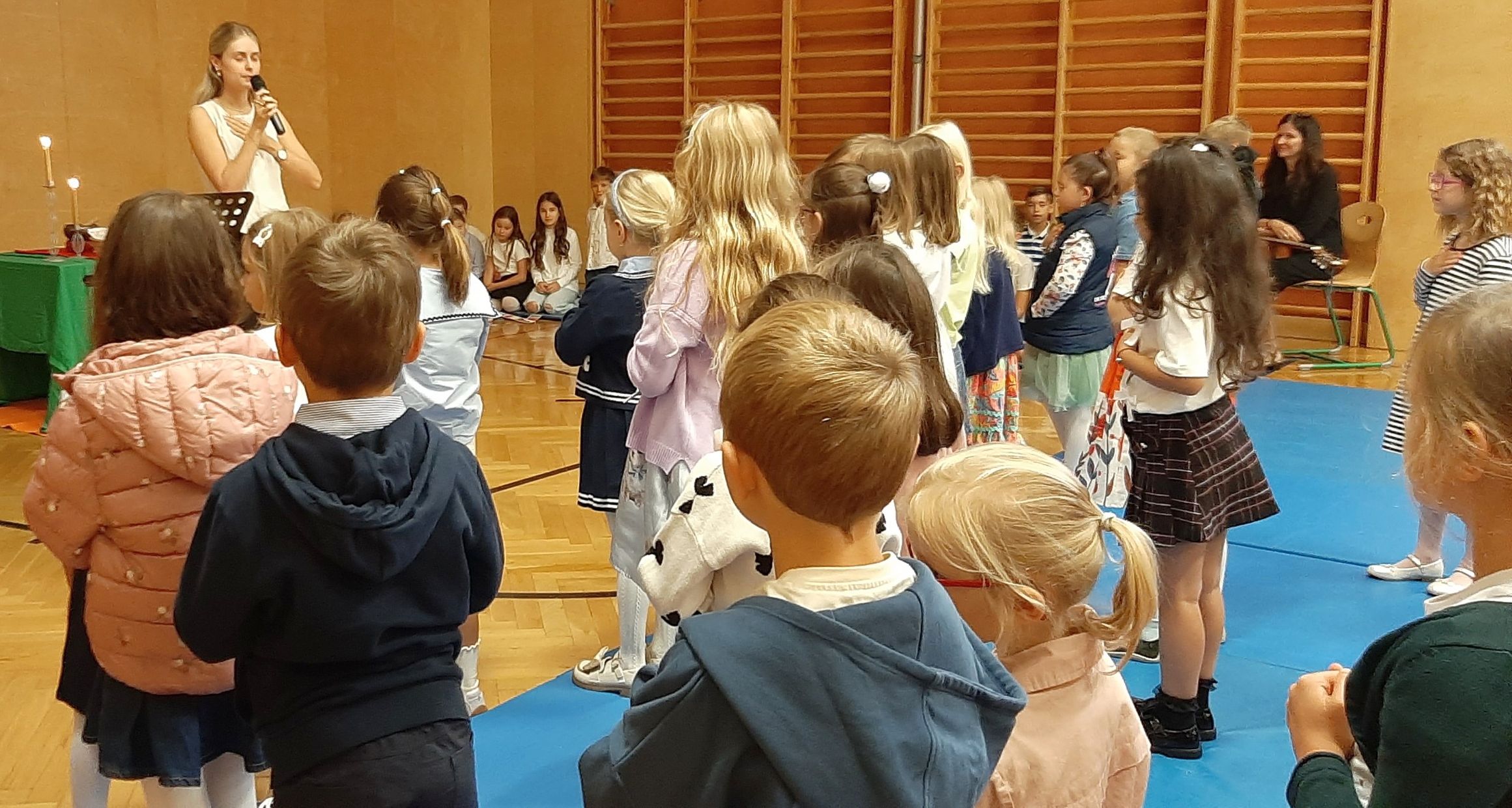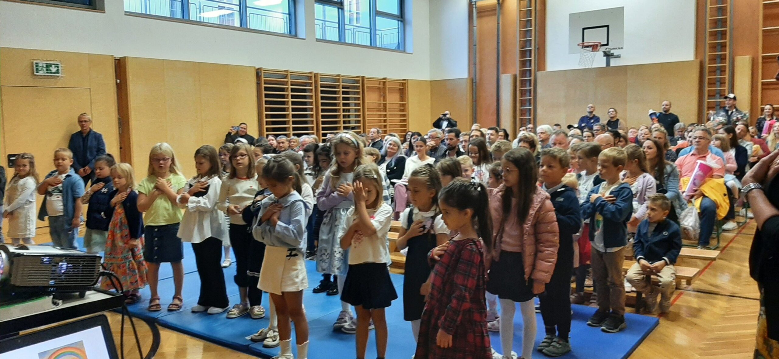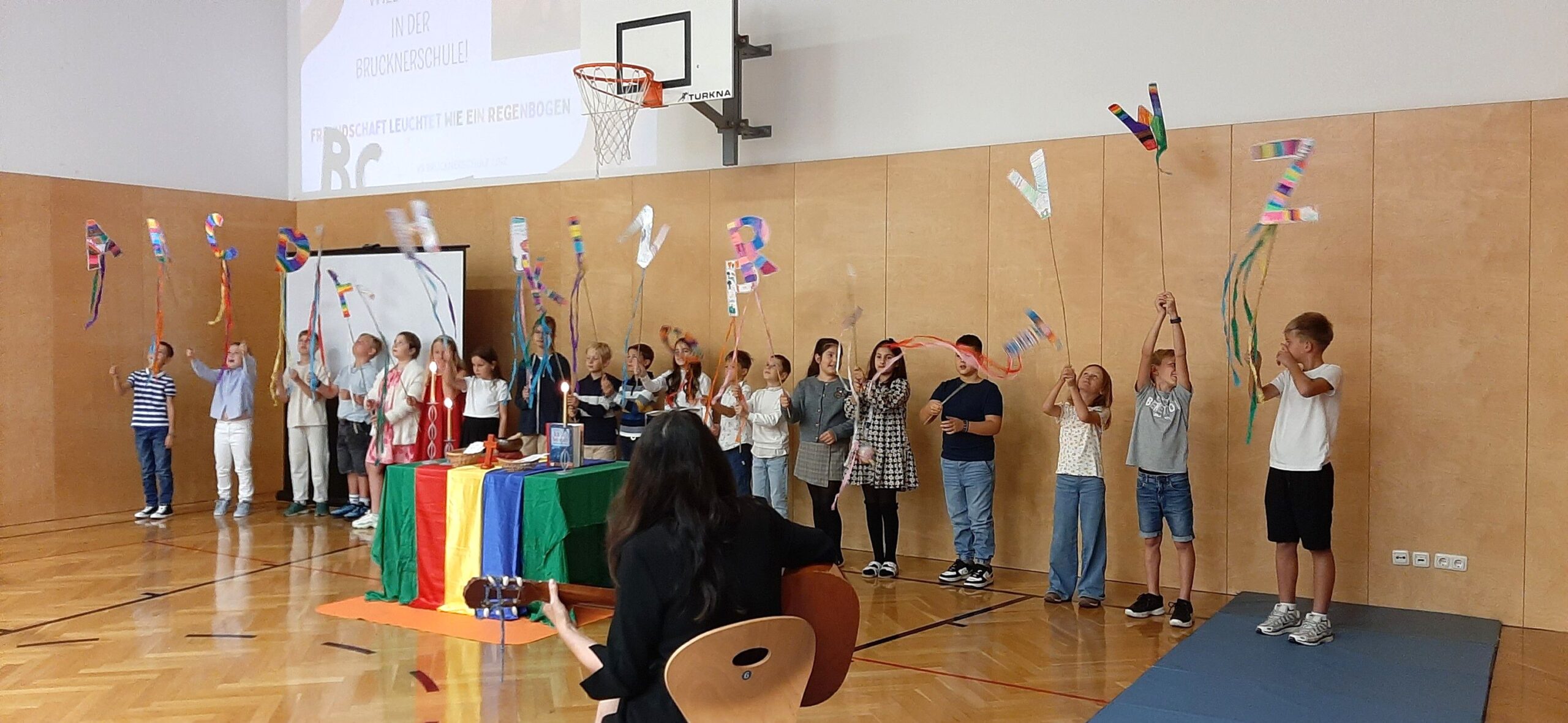 „Herzlich willkommen in der Brucknerschule.“ Die Kinder der ersten Klasse und ihre Familien versammelten sich am ersten Schultag zur Glaubensfeier im Turnsaal. Diesen besonderen Tag, der immer auch ein bisschen aufregend ist, stellten wir vertrauensvoll unter den Segen Gottes: