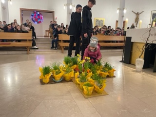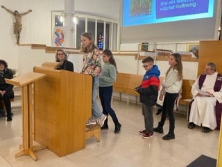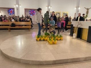So ein Weizenkorn ist ein kleines Wunder. In seinem Inneren steckt viel Kraft. In jeder Klasse haben die Schüler:innen Weizenkörner in die Erde gelegt. Es dauerte 3 bis 5 Tage, bis  sich die ersten Pflänzchen zeigten. Wir staunten über die geheimnisvolle Kraft, die die Weizenkörner  wachsen ließ. Die Töpfe mit dem jungen Weizen nahmen wir zum Gottesdienst in der Fastenzeit mit.